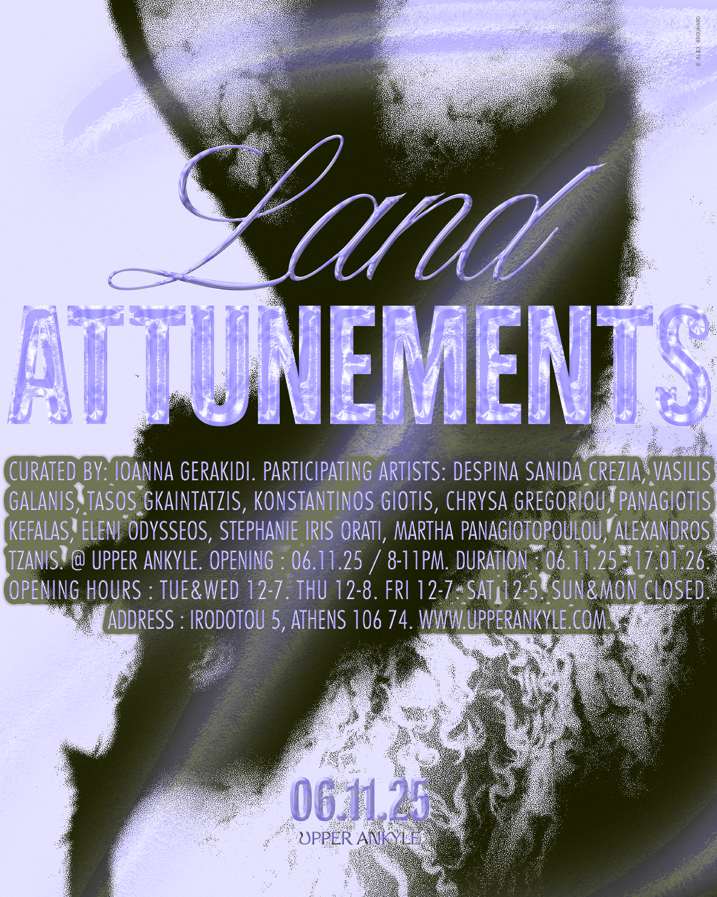 The group show “Land Attunements”, through bringing together a series of vernacular gestures arising from or related to lands lived or imagined, aims to be seen as a parable for the ways we, human beings, occupy, experience, rest or transgress, confront or fight for the physical or speculative spaces surrounding us, not for always or eventually owning them but for feeling sheltered within them. The exhibition thinks with the historical and sociopolitical framework of the location hosting it, and along, longs to envision the tools that resist exploitations, appropriations, or seizures of landscapes, sources, human, non-human and more-than-human lives.